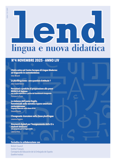 l’editoriale è come sempre attento all’attualità scolastica e a quello che Lend auspicherebbe per una scuola veramente aperta al dialogo e al pluralismo. Il contributo di J.-C. Beacco, in francese, suggerisce come sviluppare competenze plurilingui, mentre quello di La Russa è ricco di dati che riguardano le prove INVALSI di lingua inglese. Seguono poi due esperienze. La prima su un tema attualissimo e purtroppo sempre all’ordine del giorno: il femminicidio in letteratura ispano-americana e la seconda su criticità e bisogni della classe plurilingue. Il numero termina con una proposta interessante a tutti i livelli sull’insegnamento della lingua straniera, in questo caso l’arabo, ad alunni dislessici.